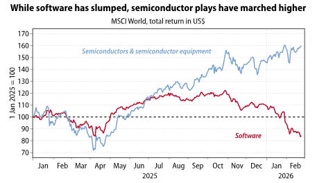 With the former (Microsoft, Oracle, IBM…) often the clients of the latter (Nvidia, AMD, SK Hynix…), this leaves investors facing a dilemma: if software stocks continue to struggle, will AI capex, on which the current valuation of semiconductor stocks depends, remain totally unconstrained?