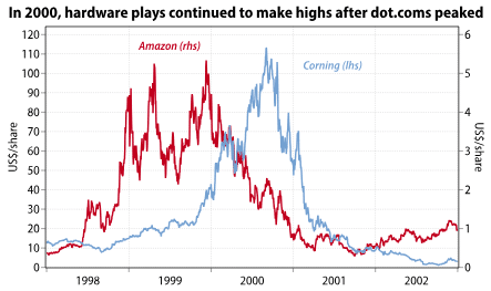 Staying on the Yogi Berra theme, today’s dichotomy is reminiscent of the market breakdown of the early 2000s. Back then, the internet was the disrupting force. However, by March 2000, dot.com companies were hitting the skids. Still, the companies building telecom networks (Corning, Cisco, JDSU, Sun Microsystems…) kept on soaring, and most made new all-time highs over the summer months. But by the time the school year restarted, it was obvious that with the dot.com companies out of cash, orders for the hardware providers were also drying up. Stocks duly tanked.